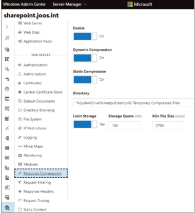 La compression peut améliorer les temps de réponses et sauvegarder la bande passante lorsqu'il faut transmettre les pages. Vous pourrez gérer cette partie avec la fonctionnalité de même nom sous IIS Manager. Quelques paramétres sont également disponible au niveau serveur. Cependant beaucoup sont également disponible au niveau des applications web. Pour les performances, une partie peut également être gérer via le cache qui permet d'éviter de recalculer le rendu en conservant l'ancienne version un certain temps. Pour cela, il faut utiliser la fonctionnalité Output Caching sur IIS Manager. Le cache est activé par défaut et il est possible d'ajuster les limites selon les besoins. Cependant, cette notion est surtout utile sur des serveurs de production.